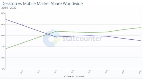 - Mobile responsiveness – this refers to a websites ability to be optimised to be functional and user-friendly on mobile devices. Recent data shows that more than 60% of searches are now carried out on mobile, with some sectors reaching 72%*