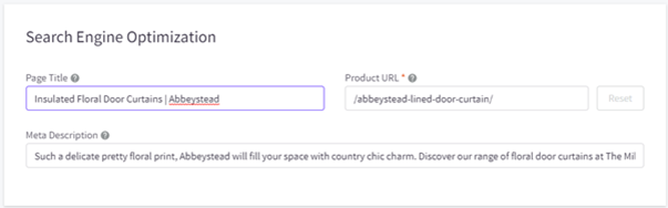 Just like your category pages, you should start with optimising the metadata and the URL, ensuring they are meaningful, in the BigCommerce dashboard that is done here: