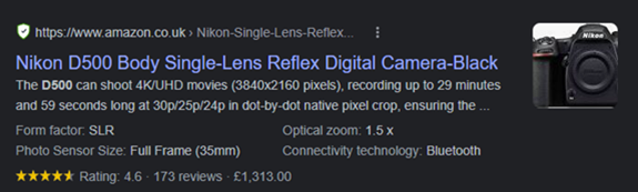 This does of course mean that it is vitally important that you populate your products with as much information as possible especially pricing and customizations, when done correctly you could start to see extra information in the SERPS such as star ratings, reviews, price, and even image as seen below.